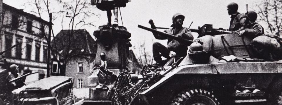 Vor 80 Jahren: amerikanische Soldaten auf dem Moerser Neumarkt, Foto: NS-Dokumentationsstelle der Stadt Moers, Nr. 300