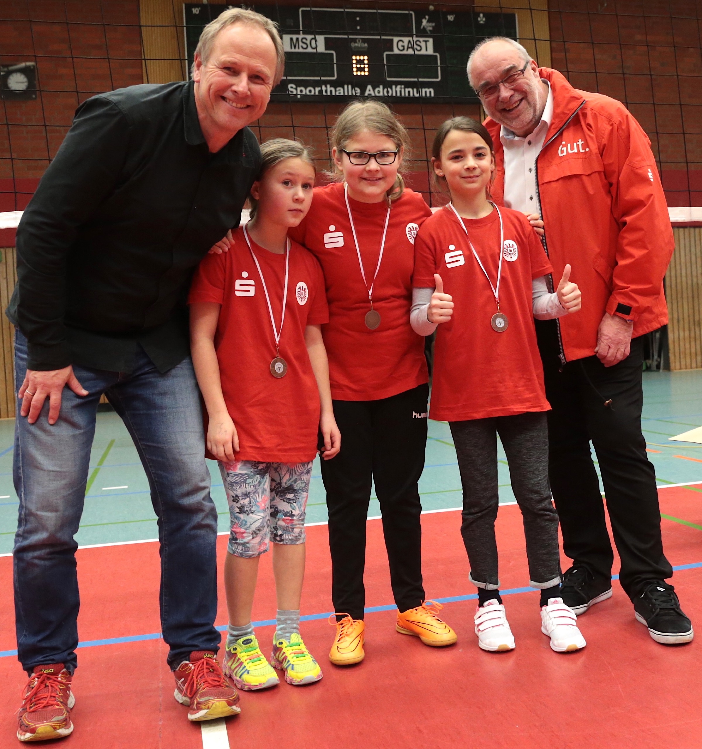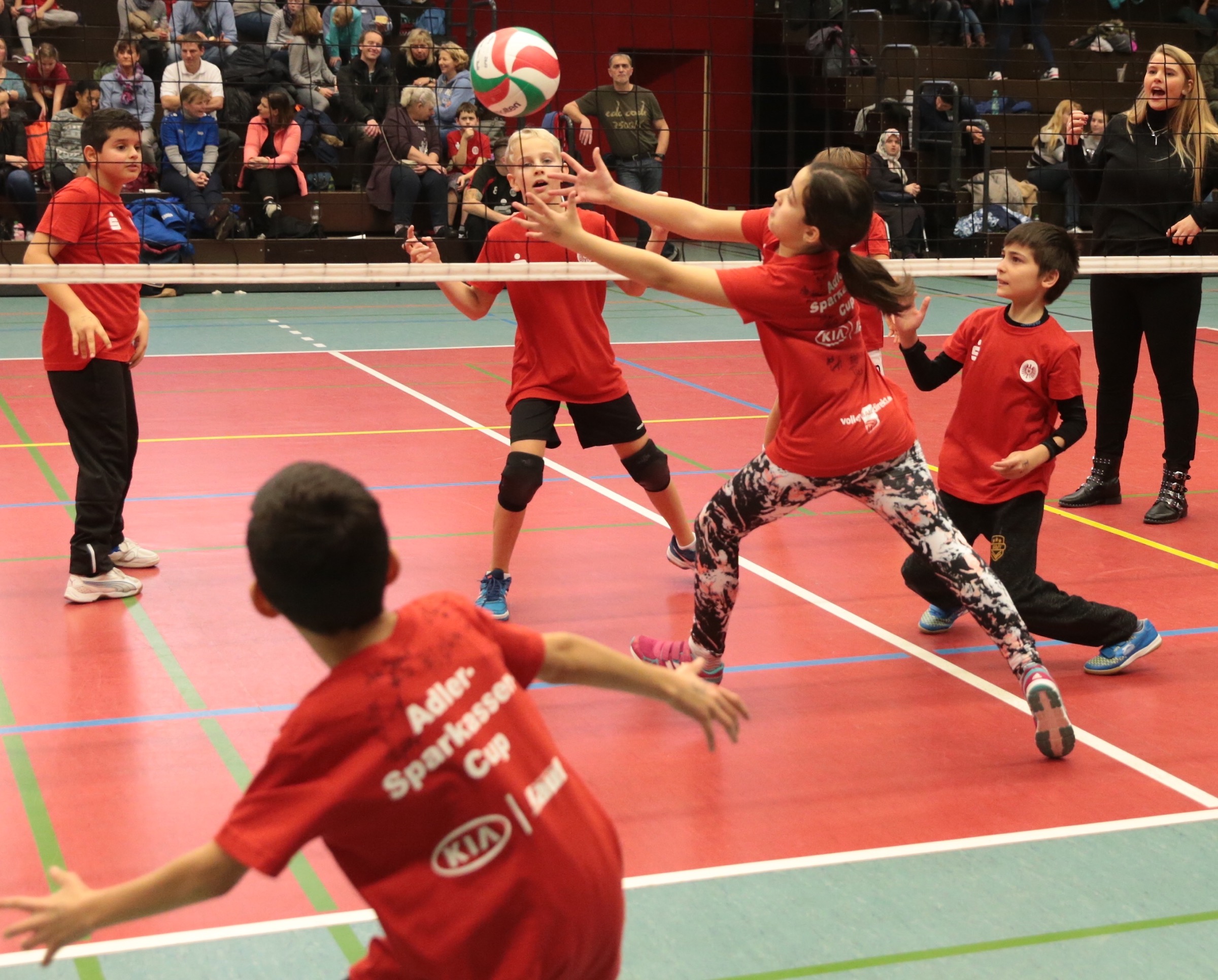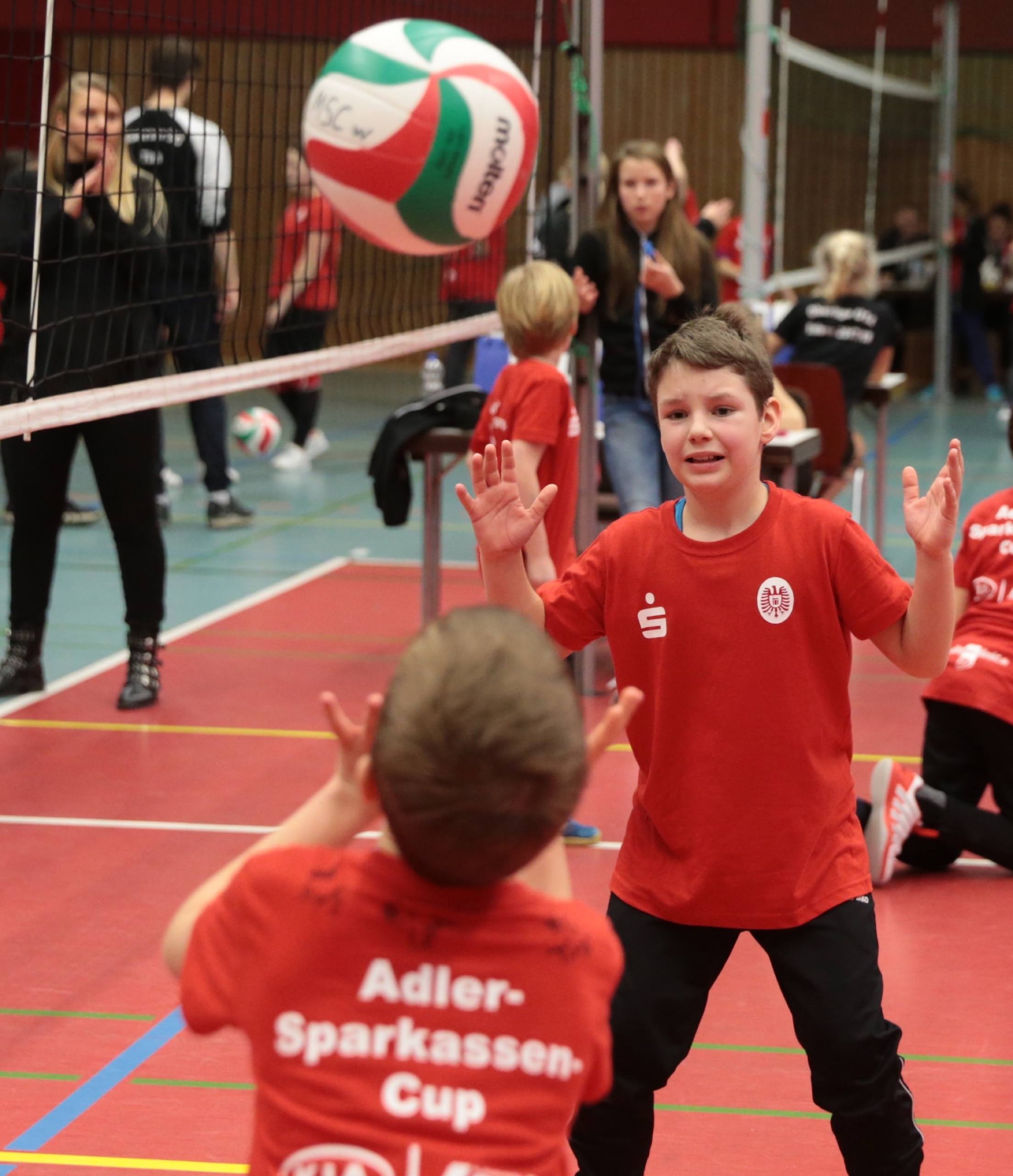 Bereits zum dreizehnten Mal in Folge fand am letzten Sonntag der Adler-Sparkassen-Cup statt: In der Sporthalle des Adolfinum warteten über achtzig erwartungsvolle Grundschüler ungeduldig darauf, einen der vielen Pokale - gestiftet von der Sparkasse - zu ergattern. 21 Mannschaften (14 Mixed- und Jungen-Teams sowie 7 Mädchen-Teams) waren auf sechs Feldern angetreten, um sich um Plaketten und Pokale zu sichern. Seit Anfang November hatten die Grundschul-Kids unter Anleitung von Sportlehrer Martin Schattenberg und mithilfe der Spieler Philippe Scheiffarth, David Seybering, Jonas Hoppe und Lukas Schattenberg aus den Reihen der ersten Herren des MSC einmal wöchentlich in ihren Gruppen trainiert, um ihr Können in der Sporthalle Adolfinum den zahlreichen elterlichen Zuschauern zu präsentieren. Unter der Wettkampfleitung von Martin Schattenberg, MSC-Trainer und Sportlehrer am Adolfinum wurde über vier Stunden um den Titel gekämpft.