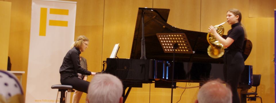 Furioser Auftritt: Leonie Kramer mit Paul Dukas „Villanelle für Horn und Klavier“ unter Begleitung der jugendlichen Pianistin Jana Eulenpesch.