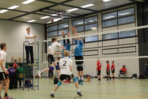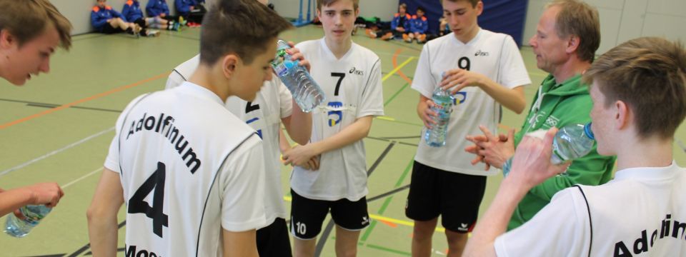 Es entwickelte sich ein absolut enges und umkämpftes Match, das von vielen Auf und Abs begleitet und mit Sicherheit an Spannung kaum zu überbieten war. Im ersten Satz eine unliebsame Erinnerung an das Bremer Spiel: Vorsprung raus gespielt, um dann am Ende durch eigene Fehler in Aufschlag und Angriff (teilweise zu überhastet abgeschlossen bzw. zu wenig Angriffsdruck durch gepritschte Bälle) entwickelten wieder mit leeren Händen da zustehen. Bei 5:11 im zweiten Satz dann das kaum für möglich gehaltene Aufbäumen. Mit 26:24 gelingt der verdiente Ausgleich. Im Entscheidungssatz sieht es bei fünf zu acht gegen die Moerser nach einer Niederlage aus, aber auch hier halten die Nerven: Bei elf ist der Ausgleich da und bei 14:12 der erste Matchball: der wird noch vergeben, doch der letzte Ball von Veit Bils wird an den Friedrichshafener Block geschlagen. Satz und Sieg gehören dem Adolfinum und Riesenjubel bei den Moerser Spielern und ihrem Coach. Im Nachhinein hat die größere Ausgeglichenheit im Kader den Unterscheid gemacht: Spielerwechsel brachten neue Impulse bzw. verschafften Stammspielern wie Moritz Liebisch Pausen, die dann in den entscheidenden Situationen wieder voll da waren. Viertelfinale gegen die Main-Taunus Schule Hofheim am anderen Tag erreicht und - ausschlafen.