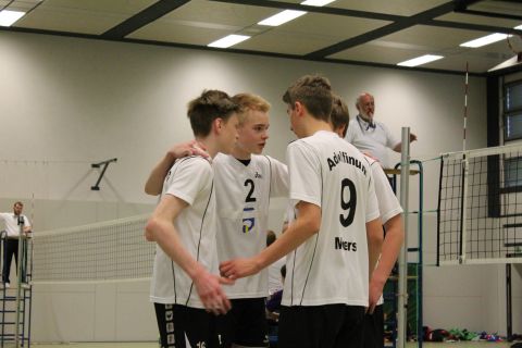 Es entwickelte sich von Beginn an ein Duell auf Augenhöhe: Die Bremer waren mit drei „Riesen“ und einem kleineren Spieler angetreten. Auch hier war die taktische Marschroute des Adolfinums schnell klar: Alles auf den „Kleinen“. Leider nicht immer von Erfolg gekrönt, vor allem im Aufschlag stieg die Fehlerquote. Vorsprünge wurden von der Startvier aus dem ersten Spiel mit hohem kämpferischem Aufwand heraus gearbeitet, aber andererseits zu schnell wieder durch einfache Fehler (Zuspiel und Angriff) wieder abgegeben. Bei 23:21 im ersten Satz war der Satzerfolg zum Greifen nah, doch die folgenden Angriffe bleiben leider alle im Bremer Block hängen oder wurden von den Bremern im Gegenangriff im Moerser Feld untergebracht. Am Ende bedröppelte Minen auf der Moerser Seite: Mit 23:25 ging der Satz an Bremen.