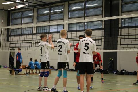Bei 11:4 hatte der gegnerische Coach schon beide Auszeiten genommen, die Hessen kamen noch einmal kurzfristig auf, aber mit 25:19 war der erste Schritt Richtung Halbfinale gemacht. Doch wie so oft nach klaren Erfolgen schalteten die Adolfiner leider einen Gang zurück: der Druck im Aufschlag ließ nach, die hessischen Angreifer kamen nun immer häufiger zum Erfolg und auch die Fehlerquote im Moerser Angriff stieg. Schnell lag man mit 7:12 hinten: doch dann das schon öfter gezeigte Aufbäumen: Punkt um Punkt wurde aufgeholt, doch leider vergaßen die vier Moerser Spieler an dieser Stelle, den Sack zuzumachen: Bei 14 beide wird eine Punktballchance leichtfertig vergeben, und anstatt selber in Führung zu gehen, geht anschließend die nächste Annahme weg, es folgen zwei Angriffsfehler und der Gegner ist wieder enteilt.