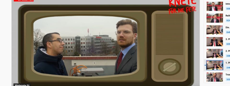 Das Finale der achten Staffel von „Knete für die Fete“ist jetzt als Video auf den Social-Media-Kanälen der Sparkasse am Niederrhein zu sehen. In vier Minuten erinnert Sparkassenchef Giovanni Malaponti kurz an das Zwischenergebnis nach dem Online-Voting, bevor er die Zuschauer zum Finale in sein Büro bittet. Dort warten bereits die zugeschalteten Jurymitglieder Verena Witthaus, Christian Schürmann, Markus Grimm, Mark Bochnig und Manuel Kutz. Nach und nach werden die erfolgreichen Schülerteams bekannt gegeben, ergänzt von Ausschnitten aus den Gewinner-Videos.