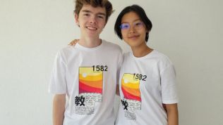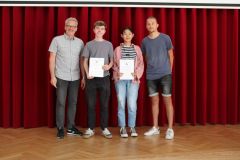 Ausgezeichnet: Mats Schröder und Lulu Wang gewannen letztes Jahr den T-Shirt-Wettbewerb und wurden vm Schulleiter Thorsten Klag und Schülersprecher Tom Steilmann beglückwunscht.