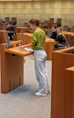 Im Plenarsaal wurde nun aus jeder Fraktion und für die Begrüßung ein Schüler oder eine Schülerin ausgewählt, die Rede am Rednerpult vorzutragen. Drei Schüler und Schülerinnen aus der 10A und zwei aus der anderen Gruppe stellten ihre Rede vor, ein Schüler aus der 10B leitete die Debatte ein. Die Redebeiträge waren rhetorisch sehr unterschiedlich aufgebaut und legten ihren Schwerpunkt auf verschiedenen Themen. In einem Beitrag nahm ein Schüler Bezug auf das Bildungssystem in Finnland, eine andere Rednerin ging auf die unklaren Formulierungen des Gesetzesvorschlages ein. Es war spannend die unterschiedlichen Positionen zu hören, sowie andere Eindrücke zu dem Thema zu erhalten, die man noch nicht betrachtet hatte. Als alle Reden vorgetragen waren, hielt der “Ministerpräsident” ebenfalls noch seine Rede. Zum Abschluss wurde die Sitzung durch die ausgewählte Landtagspräsidentin geschlossen und Frau Meier verabschiedete sich von uns.