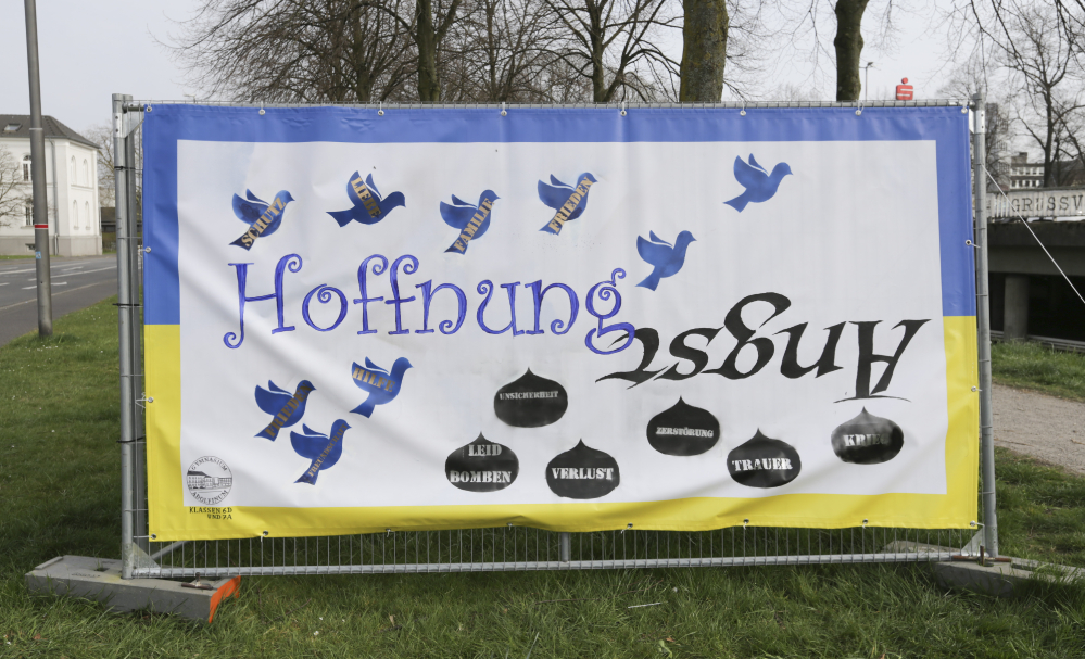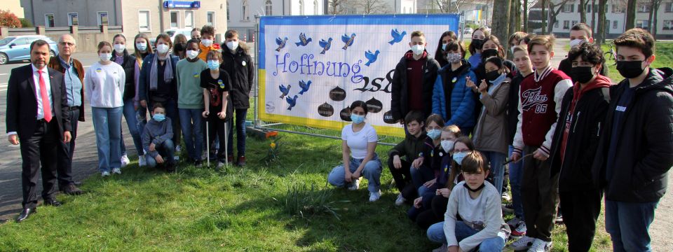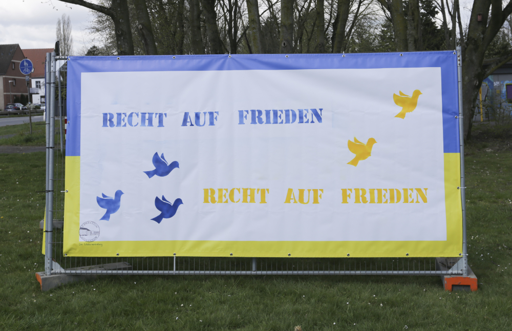 Angst und Hoffnung haben Schülerinnen und Schüler des Gymnasiums Adolfinum, wenn sie an den Krieg in der Ukraine denken. Mit diesen Gefühlen sind sie nicht allein. Dreizehn Schulen aus Moers, Neukirchen-Vluyn und Rheinberg beteiligten sich an der vom Verein „Erinnern für die Zukunft“ initiierten Ukraine-Plakataktion. „Wir haben die Kinder und Jugendlichen dazu eingeladen, ihre Gedanken und Forderungen künstlerisch zu gestalten und öffentlich zu machen“, sagt der Vereinsvorsitzende Ulrich Hecker. Insgesamt kamen 21 Plakate zusammen, die jetzt an zehn Standorten in Moers, Neukirchen-Vluyn und Rheinberg zu sehen sind. Die Sparkasse am Niederrhein übernahm die Materialkosten.