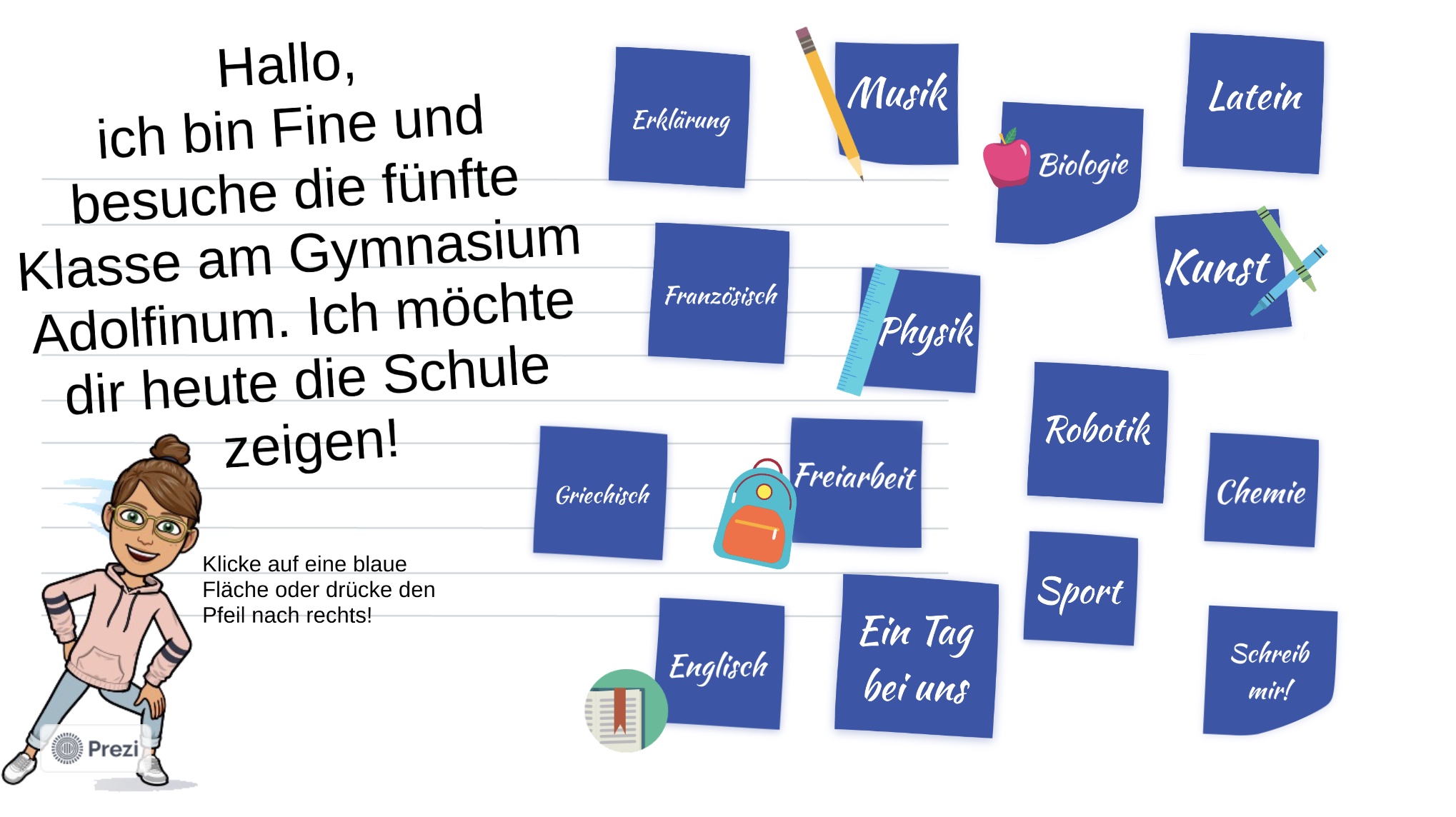 Kennst Du schon Fine? Fine kennt sich am Adolfinum gut aus und hat bereits im letzten Jahr eine Videoführung durch die Schule gemacht. Begleite sie auf ihrem Rundgang: ein Rundgang mit Fine.
