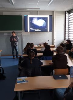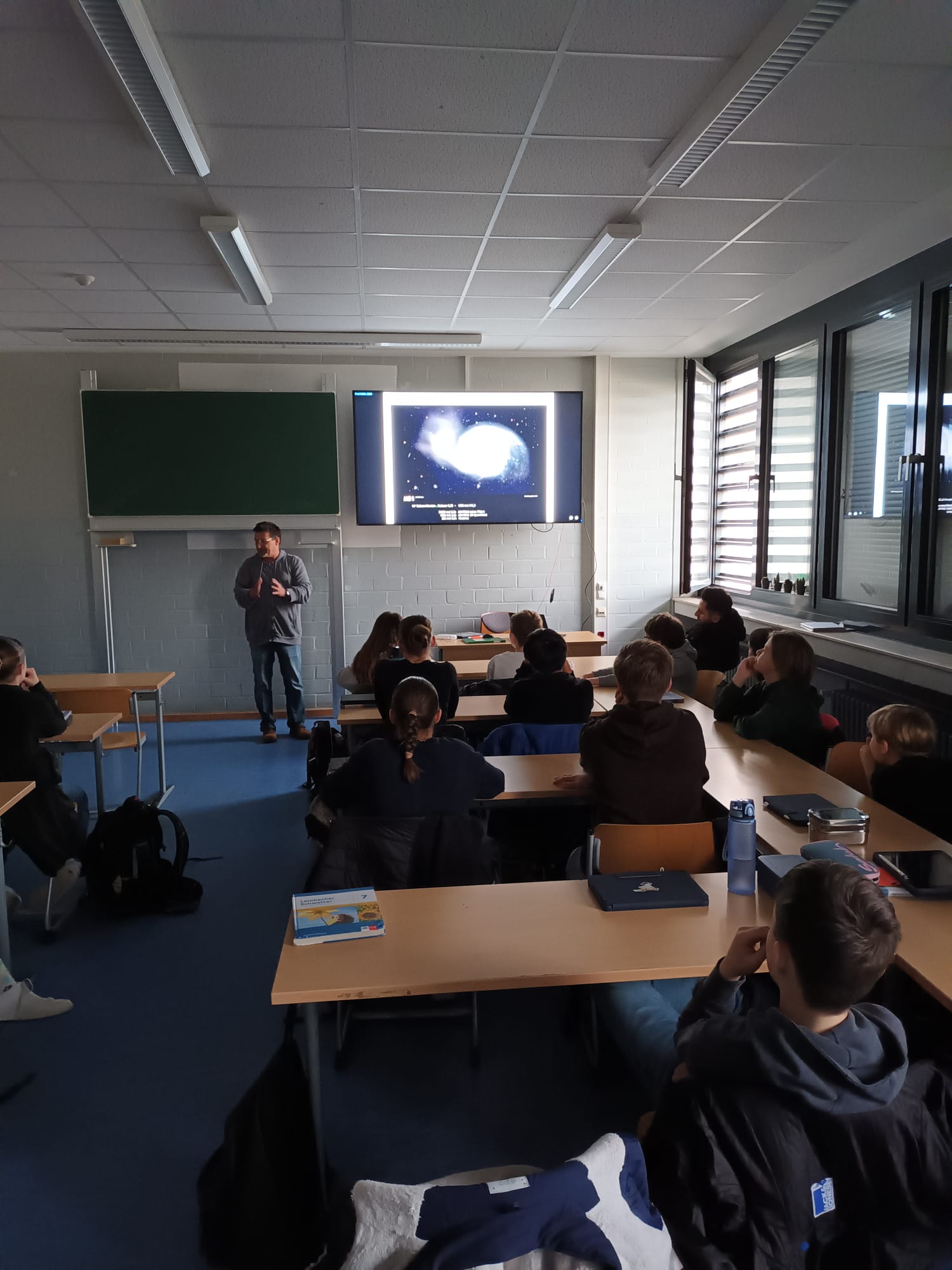 Am Freitag, den 16. Februar 2024 war es endlich so weit: Der Referendar Herr Hinz hat unserer Klasse 7e, bei der er Mathematik und Physik unterrichtet, versprochen, einen Astrofotografen passend zu unserem Thema Astronomie mit in den Unterricht zu bringen. Der Hobby-Astrofotograf Ralf Burkart kam mit seinen eigenen Fotos und Kurzvideos von Planeten, Sternen, Kometen, Galaxien und Satelliten, die er selbst aufgenommen hatte, nicht nur sehr gut bei den 12- und 13-jährigen Schülerinnen und Schülern an, sondern übertraf auch noch deren Erwartungen.