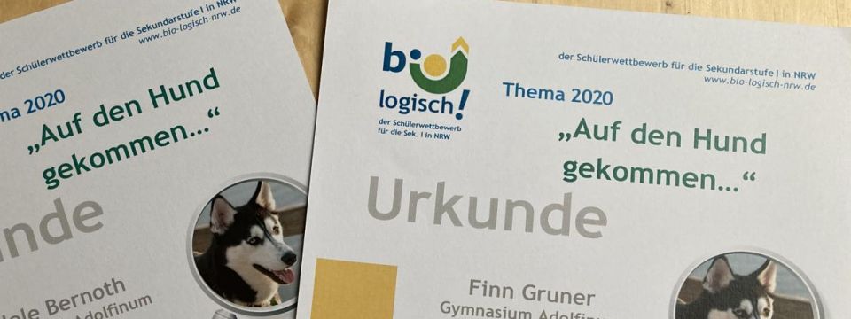 Das Ministerium für Schule und Bildung in NRW führt für die Sekundarstufe I aller Schulformen den Wettbewerb „bio-logisch!“ durch. In diesem Jahr lautete das Thema: „Auf den Hund gekommen!“. Rund 3.000 Schülerinnen und Schüler nahmen an diesem Wettbewerb teil, darunter 217 Adolfiner aus den Jahrgangsstufen 5 bis 9. Sie beschäftigten sich auf vielfältige Art und Weise mit dem Thema "Hund": Der richtige Riecher, die beeindruckende Intelligenz, die Spitzengeschwindigkeiten einiger Hunderassen, die Kommunikation von Hunden sowie gefährliche Hunde waren Untersuchungsgegenstände im Fernlernportal des Adolfinums, da zu Beginn des Wettbewerbes die Schulen geschlossen waren. So fand „bio-logisch!“ auch erstmalig ohne praktische Übungen statt.