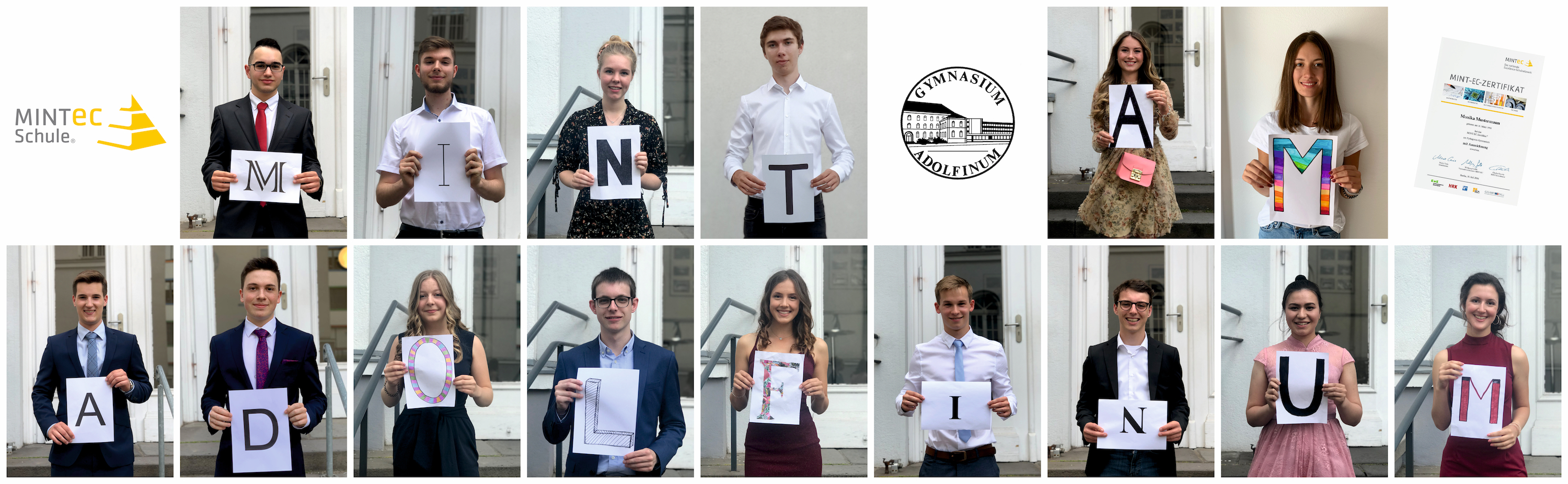 Im Rahmen der Vergabe der Abiturzeugnisse wurden 7 Adolfinerinnen und 8 Adolfiner mit dem MINT-EC-Zertifikat für herausragende Leistungen und besonderes Engagement in den MINT-Fächern (Mathematik, Informatik, Naturwissenschaften, Technik) ausgezeichnet. Insgesamt 4 der 15 Zertifikate wurden in der höchsten Stufe „mit Auszeichnung“ vergeben. „Von den aktuell 312 Schulen in ganz Deutschland, die das MINT-EC-Zertifikat vergeben dürfen, werden im Mittel 6 Zertifikate pro Schule verliehen. Unser Abiturjahrgang liegt mit 15 verliehenen Zertifikaten deutlich über diesem Durchschnitt“, freut sich Mathematik- und Physiklehrer Tim Herrmann, der verantwortlich für die Vergabe des Zertifikats am Adolfinum ist und ergänzt: „Auffällig ist außerdem, dass an unserer Schule überdurchschnittliche viele Abiturientinnen in den MINT-Fächern glänzen und ein MINT-EC-Zertifikat erhalten. Hier macht sich unsere gleichberechtigte Förderung der Mädchen und Jungen in den MINT-Fächern beginnend in der Sekundarstufe I bezahlt.“ Das Adolfinum ist seit 2010 Teil des nationalen Excellence-Schulnetzwerks MINT-EC und darf somit das bundesweit einheitliche MINT-EC-Zertifikat vergeben.