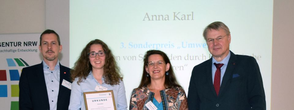 Bei dem „Jugend forscht“-Landeswettbewerb im April 2019 wurde Anna Karl, Schülerin des Abiturjahrgangs 2019, der "Sonderpreis Umwelt" für ihr Forschungsprojekt „Reduktion von Stickoxiden durch biochemische Verfahren“ zuerkannt. Am Dienstag, 24. September 2019 war es dann soweit. Eingebettet in einen festlichen Rahmen aus der Laudatio der "Jugend forscht"-Jury und musikalischen Beiträgen überreichte Dr. Heinrich Bottermann, Staatssekretär des Ministeriums für Umwelt, Landwirtschaft, Natur- und Verbraucherschutz des Landes Nordrhein-Westfalen Anna Karl ihre Urkunde.