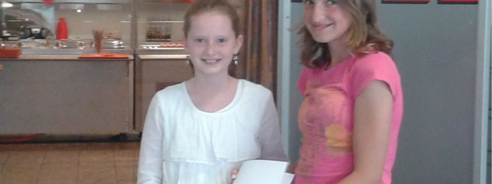 Beste Online-Schülerzeitung: die Redakteurinnen Sira-Liara van Dyck (Klasse 5b) und Hannah Kambartel (Klasse 7d) bei der Preisverleihung.