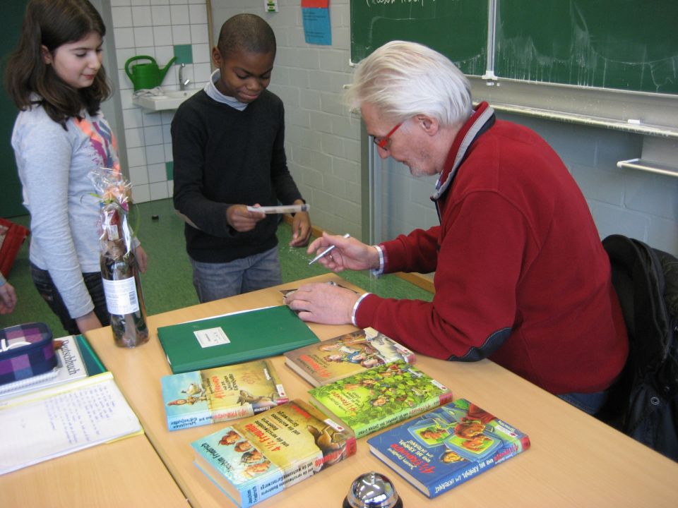 Und Joachim Friedrich war außerdem nicht mit leeren Händen gekommen: Er verschenkte  Autogrammkarten und signierte Bücher von Schülern der 5c und aus der Schülerbücherei. Seine Romanreihe "4 1/2 Freunde" von kann man in der Schülerbücherei ausleihen und demnächst wird bestimmt auch sein neues Buch dort zu finden sein.