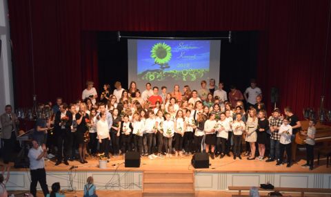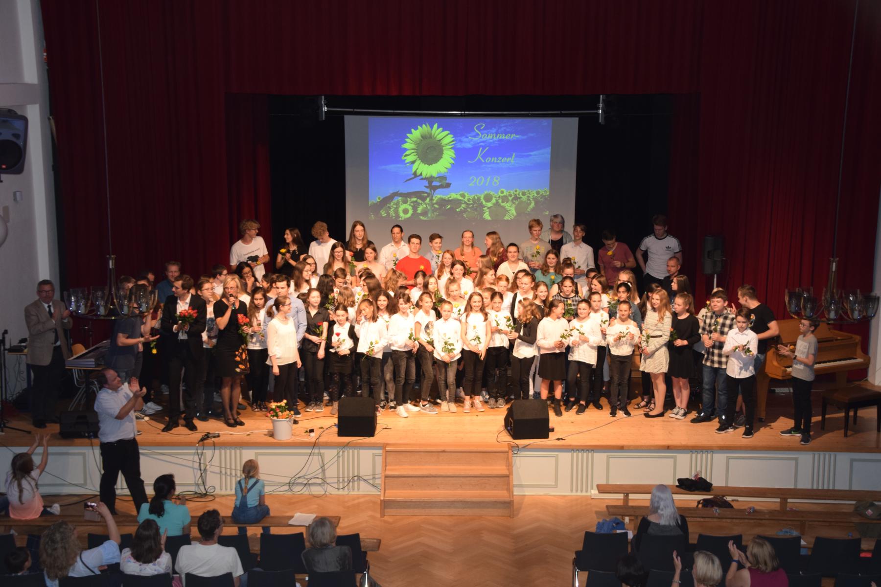 Strahlen mit den Sonnenblumen um die Wette: die Ausführenden des Sommerkonzertes beim wohlverdienten Schlussapplaus.