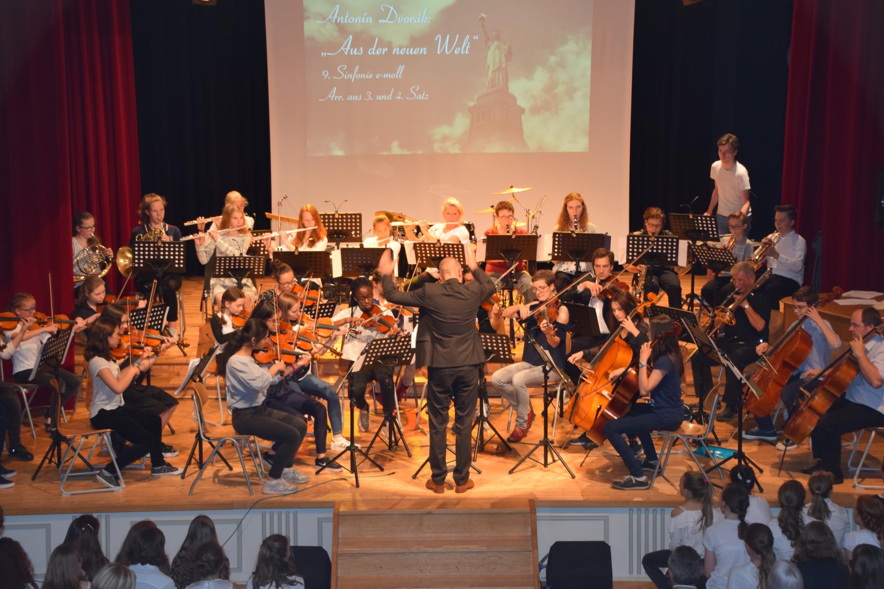 Die neugegründete JungeSinfonieMoers verblüffte bei ihrer Premiere auf der Bühne des Adolfinum mit einem satten Orchesterklang in zwei mitreißend gespielten Sätzen aus Dvoraks Sinfonie „Aus der neuen Welt“. An diesem Premierenabend spielte das Ensemble unter Leitung von Georg Kresimon, dem Leiter der Moerser Musikschule.