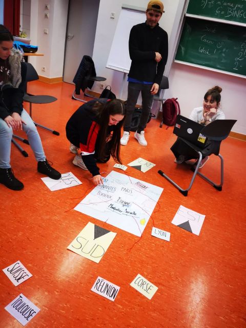 Auch für die Gruppe der Neuntklässler wählten die Lektoren einen handlungsorientierten Zugang, um mit den Jugendlichen die französische Geografie zu erkunden. Die in einem französischen Rap-Song erwähnten Städte sollten auf einer großen Frankreichkarte verortet werden. „Das hat Spaß gemacht“, sagte Lukas Genkel (9d). „Ich habe die Lektoren auch gut verstanden.“