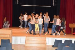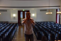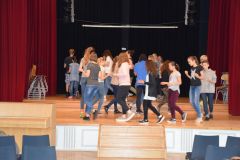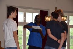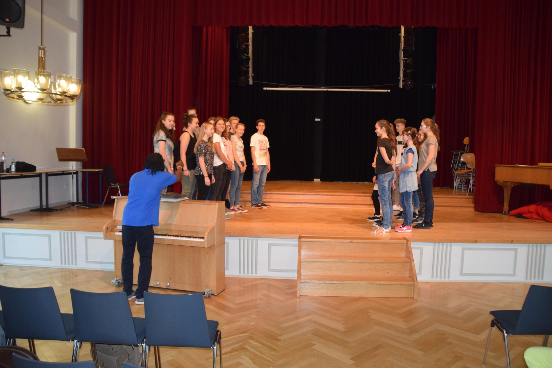 Nach einem gemeinsamen Mittagessen startete der Oberstufen mit DMJ in den zweiten Block des Workshops. Dabei ging es vorrangig um die Arbeit an den Stücken, die der Oberstufenchor unter anderem beim Sommerkonzert präsentieren wird. Die Schülerinnen und Schüler arbeiteten z.B. bei dem bekannten Gospel „Let us break bread together“ an der Phrasierung, Artikulation und Aussprache, um den gospeltypischen Klang entwickeln zu können. Das Highlight des Blocks war die Einstudierung einer umfangreichen und impulsiven Choreographie zu „Cheerleader“ des weltbekannten A-cappella-Gruppe „Pentatonix“ aus dem Bereich der Popmusik. Durch die Verbindung von Tanz und Gesang als ganzheitliche Erfahrung konnten die Schülerinnen und Schüler bislang unbekannte Energien freisetzen. Auch wenn auf die Choreographie beim Sommerkonzert verzichtet werden muss, wird der Chor versuchen, die gleichen Energien bei ihrer Perfomance freizusetzen.