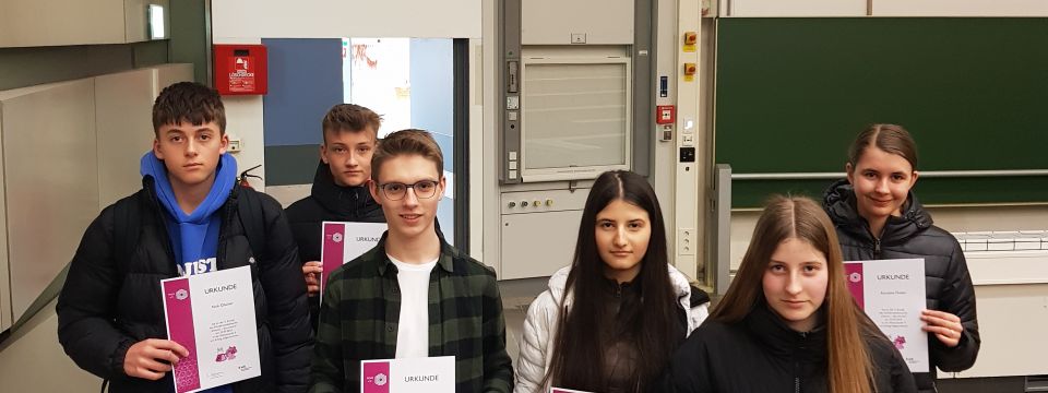 Am 22. März 2023 ging es für Ron Eßing, Malva Rasheed (beide Klasse 8e), Timo Bartels (Klasse 9e), , Fenja Winkler, Karoline Finkler und Nick Olschner (alle Klasse 8d) zur Universität Münster. Ihr Ziel: die zweite Runde des Wettbewerbs "Chemie - die stimmt!". Begleitet wurde die Fahrt von Lena Kahlert, Chemielehrerin der Klasse 8d.