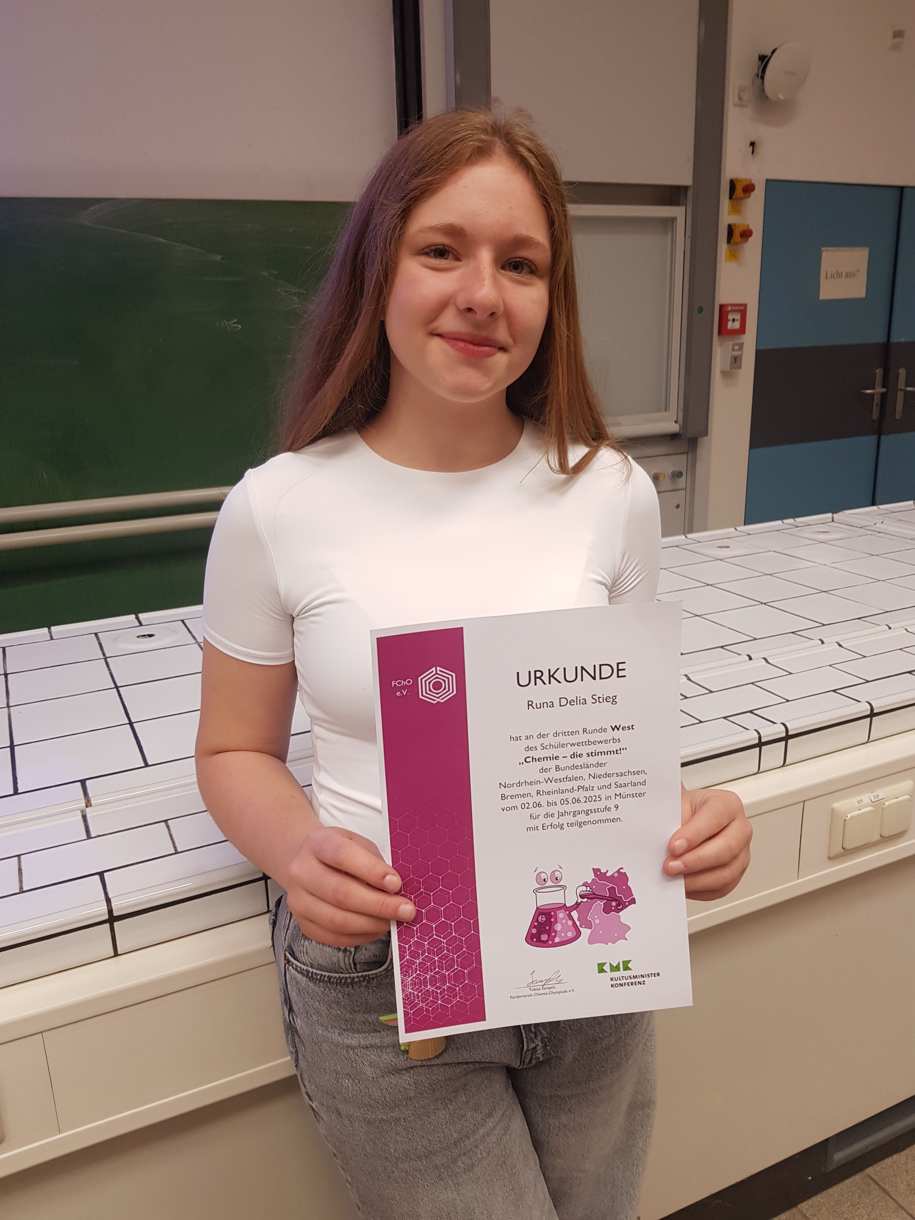 Am 5. Juni 2025 erlebten 34 ausgewählte Schülerinnen und Schüler aus ganz Nordrhein-Westfalen ein wahres Feuerwerk der Naturwissenschaften: Bei der dritten Runde des Wettbewerbs „Chemie – die stimmt!“ an der Universität Münster wurden sie mit einer spektakulären Experimentalshow in die „Bunte Welt der Chemie“ eingeführt. Mit dabei: Runa Stieg aus der Klasse 9b des Gymnasiums Adolfinum.