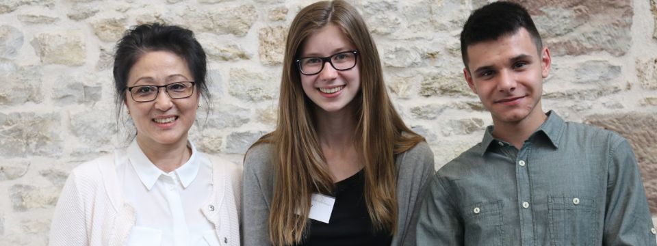 Zum Deutschlandfinale in Göttingen: Antonia Schindelmann und Batuhan-Yilmaz Ay mit Chinesisch-Lehrerin Yihu Schlossarek.