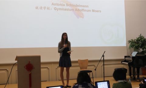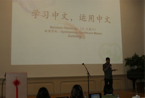 Während Antonia im ersten Teil der Prüfung – dem Kommunikationsteil - ihre Kenntnisse über die Teekultur in den chinesischen Teehäusern präsentierte, erläuterte Batuhan Aspekte des Lernens und Kommunizierens in der chinesischen Sprache. Im letztenTeil der Prüfung – dem Darbietungsteil – sang Antonia ein bekanntes chinesisches Lied. Batuhan trug ein Gedicht vor. Beide haben ihre Prüfung erfolgreich gemeistert, freut sich Chinesisch-Lehrerin Yihu Schlossarek: "Dies ist umso anerkennenswerter, wenn man weiß, dass die Prüfung in Chinesisch erfolgte und beide über nur neun Monate Lernerfahrung der chinesischen Sprache verfügen. Zu Recht wurden Antonia und Batuhan für ihre erbrachten tollen Leistungen von den Juroren ausgezeichnet".