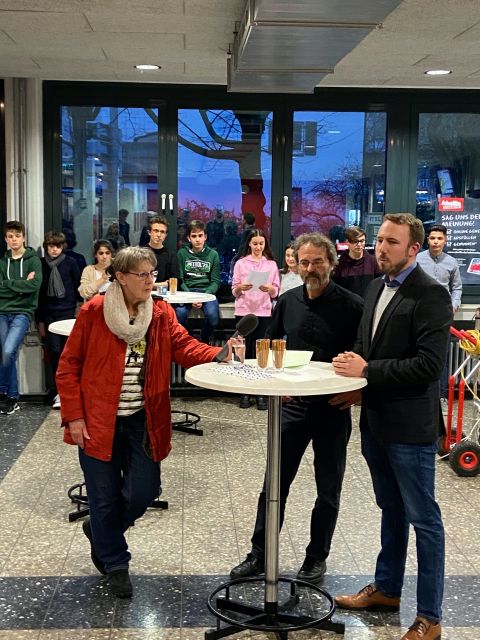 Freuten sich über großen Zuspruch bei der Eröffnung der Ausstellung: Dr. Ulrich Steuten (Mitte) von der VHS Moers-Kamp-Lintfort und Lehrer Marcel Buchmüller (Fachvorsitzender Geschichte).