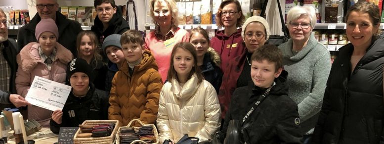 Spendenübergabe vor Ort: Schulleiter Thorsten Klag begleitete Tatjana Meier mit ihrem DaZ-Kurs zum Weltladen.