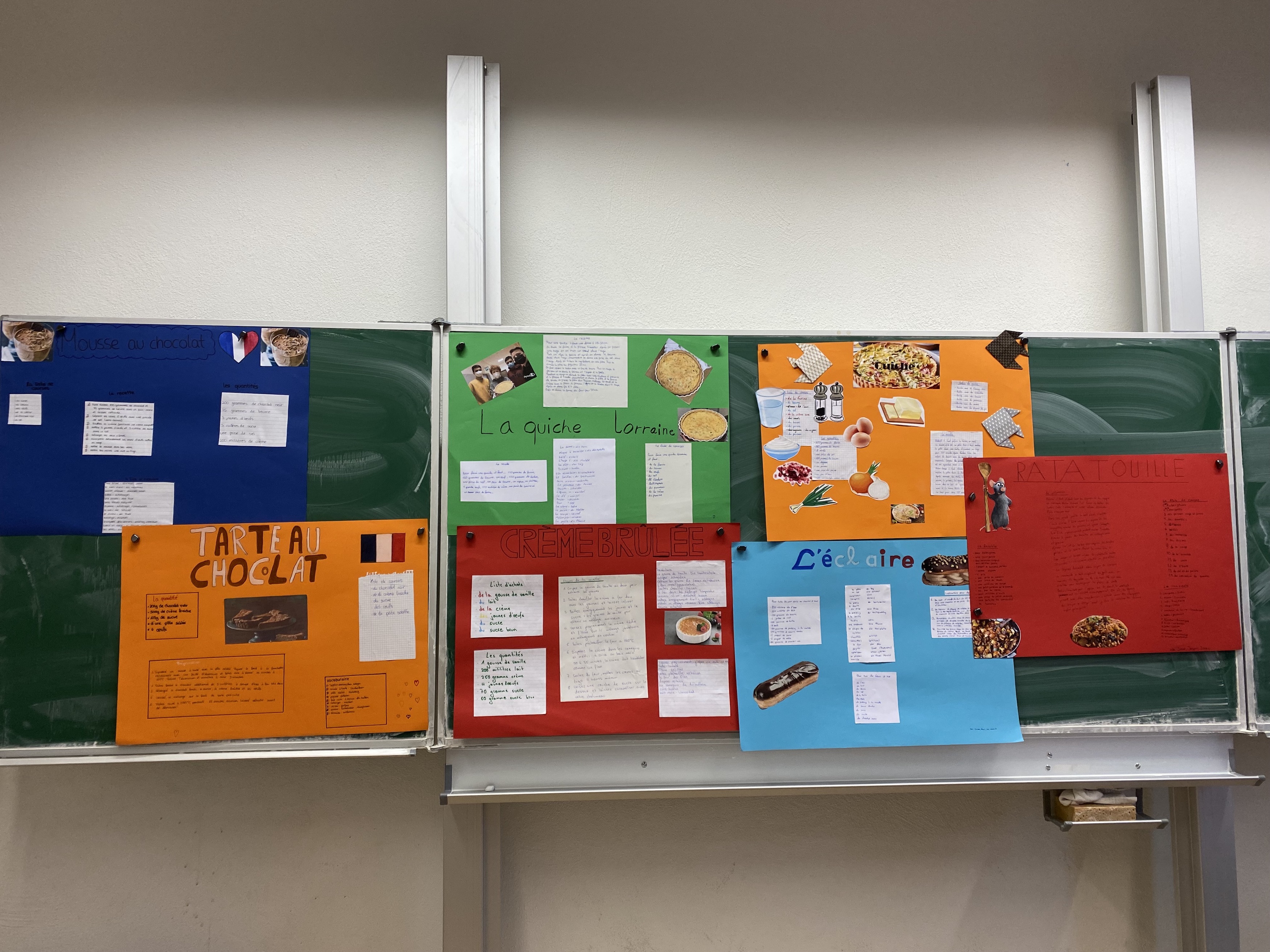 Damit wir das verstehen und auch zu verwenden lernen, sollten wir in Gruppen Plakate über ein typisch französisches Gericht erstellen. Dafür haben wir im Unterricht eine bestimmte Zeit bekommen, den Rest sollten wir zu Hause machen. Auf die Plakate sollten: das Rezept, die Einkaufsliste, das Rezept ausgeschrieben, also z.B. man rühre einmal um… und eine Vokabelliste mit den Vokabeln, die wir im Unterricht noch nicht gelernt hatten (das Ganze natürlich auf Französisch). Es gab Plakate über Crème brûlée, eine Quiche, Mousse au chocolat oder éclairs. Auch mit dabei waren eine Tarte au chocolat und Ratatouille. Nach der Sichtung der Plakate haben wir uns noch mithilfe eines Arbeitsblattes auf die Suche nach dem Gericht mit den meisten Zutaten oder denjenigen, die im Ofen gebacken werden müssen, gemacht.