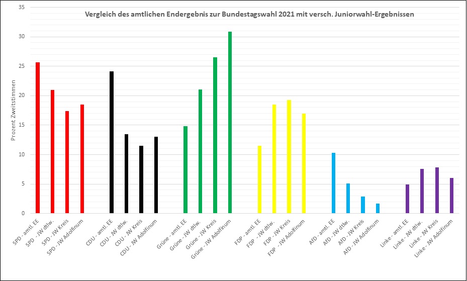 Nachfolgend können Interessierte die Ergebnisse der Juniorwahl deutschlandweit, auf unseren Wahlkreis „Krefeld II – Wesel II“ (also inklusive weiterer in diesem Wahlkreis teilnehmenden Schulen) und auf das Adolfinum allein bezogen betrachten und mit dem amtlichen Endergebnis der Bundestagswahl vergleichen.