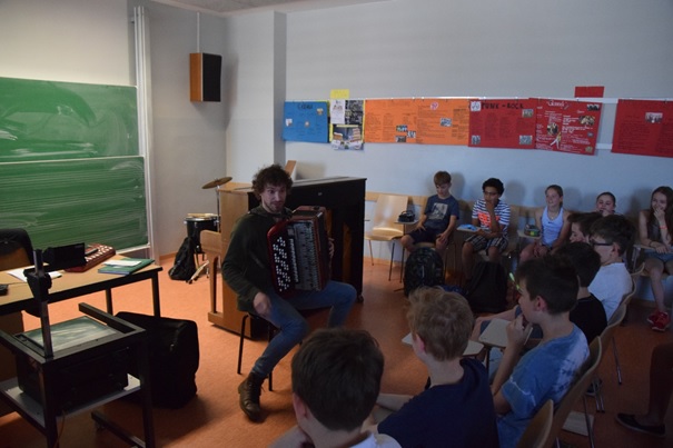Er hatte sein Akkordeon dabei, und uns seine Musik, die er eigentlich für Filme schreibt, vorgespielt. Dazu durften wir dann auch unsere Meinung vorbringen, aber auf Englisch. Yegor war auf Konzertreise, weswegen er bei uns einen kurzen Zwischenstopp einlegte. Später hat er uns auch noch die sehr schwierige Mechanik und Kunst des Akkordeonspielens erklärt, die ein bisschen nach Klavier und Orgel aussah. Entsprechend viele „Musikarten“ konnte er uns dann auch vorspielen, wie z.B. die ersten Takte der „Toccatta“ (natürlich mit Orgelsound).