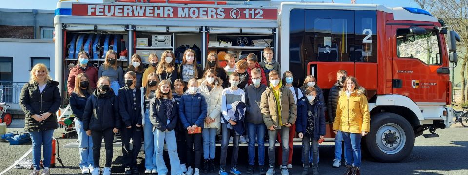 „Die Idee ist mit den Themen Brand und Brandbekämpfung im Chemieunterricht entstanden. Für mich war es logisch, dafür Kontakt mit der Feuerwehr aufzunehmen", erläutert Klassenlehrerin Katharina Adams. Für die Schulstunde haben die Feuerwehrleute gezeigt, wie man einen Ölbrand in einem Topf behandelt: durch Ersticken des Feuers mit dem Topfdeckel. Beteiligt waren Mitglieder des Löschzugs Hülsdonk und der Jugendfeuerwehr Moers. Welche Auswirkungen lediglich eine kleine Menge Löschwasser auf einen heißen Topf mit Öl hat, haben die Feuerwehrleute ebenfalls demonstriert. Die meterhohe Stichflamme sorgte bei den Schülerinnen und Schülern für großes Erstaunen und überraschte Ausrufe. „Nur ein Liter Wasser erzeugt 1700 Liter Dampf. Gerade in geschlossenen Räumen ist das fatal“, erläuterte Frank Vutz, stellvertretender Leiter der Feuerwehr Moers. Für die Demonstration haben sich die Moerser Wehrleute einen sogenannten Firetrainer ausgeliehen.