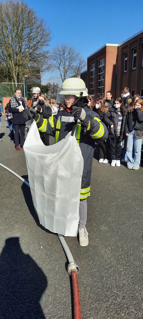Knall, Rauch und Feuer: Sehr plastisch haben die Schülerinnen und Schüler der Klasse 7d des Gymnasiums Adolfinum am vergangenen Freitag den Chemieunterricht erlebt. Die Feuerwehr Moers war zu Gast und hat auf dem Schulhof über die Gefahren von Feuer und die richtige Bekämpfung aufgeklärt.