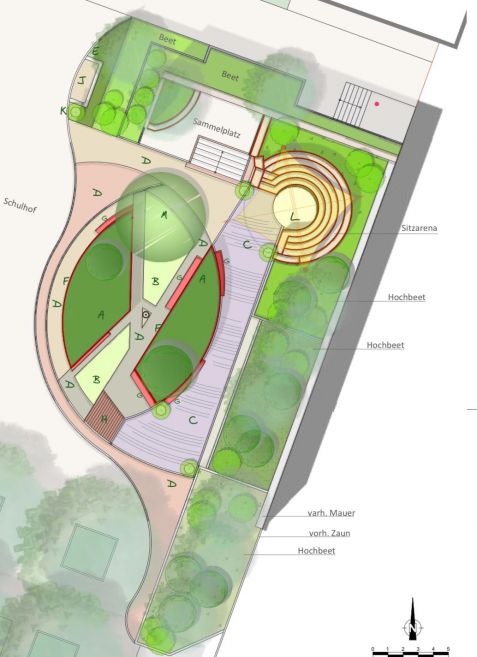 Zu verwirklichen wäre diese Idee in zwei verschiedenen Plänen, die das Planungsbüro Lange unter der Leitung von Herrn Kerstan entwickelte. In einem gemeinsamen Treffen mit der Schulleitung und den Mitgliedern des Arbeitskreises wurden beide Pläne ausführlich gesichtet, wobei einer vom Arbeitskreis und insbesondere von den Schülerinnen und Schülern deutlich präferiert wurde. „Um diese Planung der gesamten Schulöffentlichkeit zugänglich zu machen, haben wir sie maßstabsgetreu auf den bestehenden Pausenhof übertragen“, fährt Maja Stolte fort. Die Gegenüberstellung von Zeichnung und Foto zeigt die Anbindung des Projekts an die bestehenden Strukturen aus Schulgarten und Freiluftklassenzimmer.