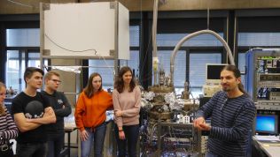Im Anschluss an die Experimente erhielt der Kurs einen Einblick in die Labore der Universität und konnte einem Dozenten des Lehrstuhls für Angewandte Festkörperphysik Fragen zu seinem Forschungsgebiet, zum Physikstudium und zur Arbeit als Forscher an einer Universität stellen. Dabei erfuhren die Schülerinnen und Schüler viele interessante Details über die Forschung an Ultrahochvakuum-Physik, Quantenkaskadenlasern und über die Untersuchung von eindimensionalen Quantendrähten oder nulldimensionalen Quantenpunkten für die Entwicklung von Quantencomputern.