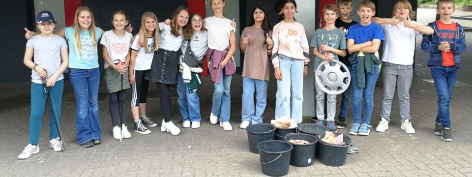 Am Montag begannen die Anti-Müll-Wochen 2024: Bis zum Ende der kommenden Woche wollen wir besonders darauf achten, Abfälle zu vermeiden und die Abfälle richtig zu sortieren. Zum Auftakt haben die Klimahelden-AG zusammen mit weiteren Schülerinnen und Schülern der 5. Klassen die Schule einmal komplett aufgeräumt.