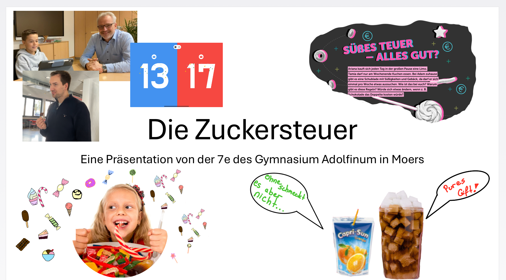 Die Klasse 7e des Gymnasiums Adolfinum hat sich in einem spannenden Projekt intensiv mit dem Thema Zuckersteuer auseinandergesetzt. Unter der Leitung ihrer Klassenlehrer Frau und Herr Mecklenburg haben die Schülerinnen und Schüler eine beeindruckende Vielzahl an Aktivitäten durchgeführt, um sich diesem kontroversen Thema zu nähern.
