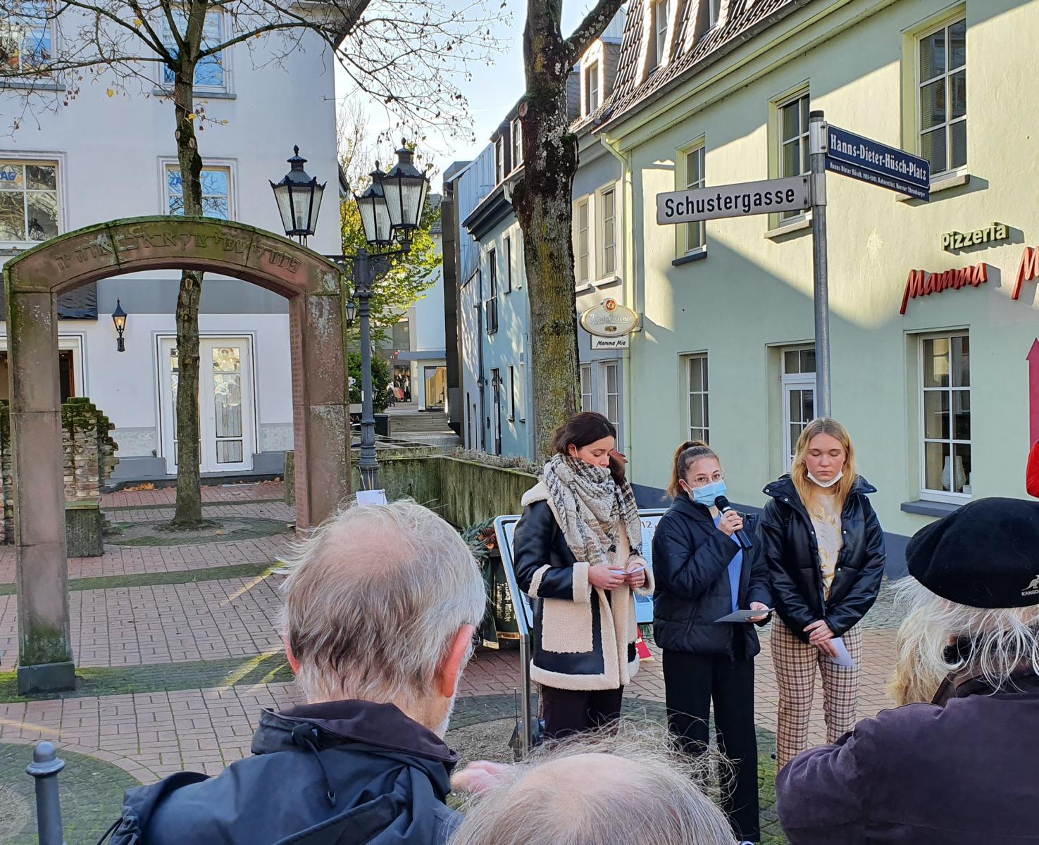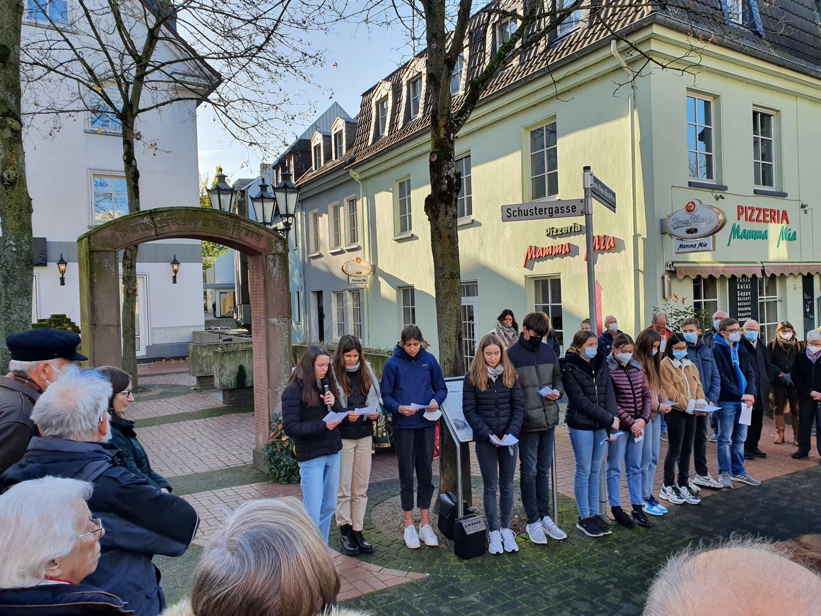 Am 9. November fand am Moerser „Synagogenbogen“ die alljährliche Gedenkveranstaltung zum Pogrom von 1938 statt. Auch in diesem Jahr waren zahlreiche Schülerinnen und Schüler des Gymnasium Adolfinum vor Ort, um den ermordeten jüdischen Bürgerinnen und Bürgern der Stadt Moers zu gedenken und die Veranstaltung durch Redebeiträge mitzugestalten.
