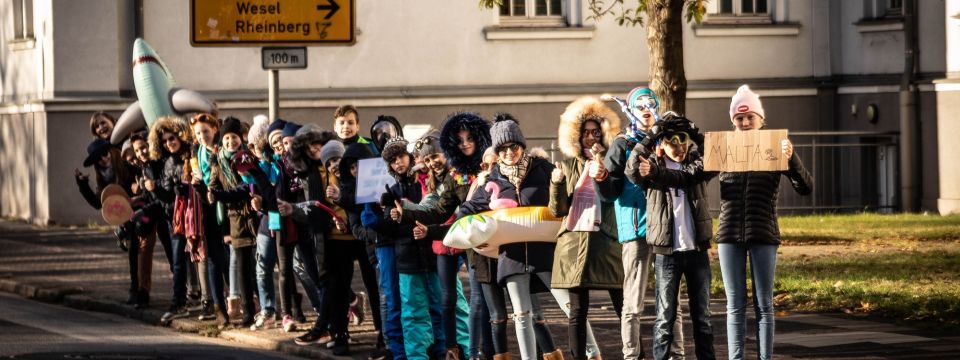 Da ließ sich die Klasse 7e nicht zweimal bitten. Mit viel Mühe, jede Menge kreativen Ideen und nach einigen Abstimmungen einigte sich die Klasse auf eine Idee: Die Kinder stellten sich mit dicken Winterklamotten an die Straße und hielten Trampingschilder mit der Aufschrift „Malta – Hier ist es einfach zu kalt“ und typischen Sommerteilen wie Taucherbrille, aufblasbare Haifische etc. in die Luft. Lou Schulz, ein Schüler der Q1, schoss für die Klasse ein paar Fotos mit seiner Kamera.