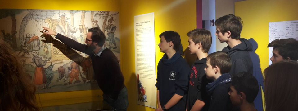 Eigentlich denkt jeder, dass mit dem Ende des Mittelalters auch alle düsteren Geschehnisse dieses vermeintlichen dunklen Zeitalters ein Ende haben. Das glaubte auch die Klasse 8e, die sich im Rahmen des Geschichtsunterrichts mit Frau Mecklenburg mit der Frage „Neuzeit – eine neue Zeit?“ intensiv mit diesem Thema beschäftigt hat. Leider wird jedoch jeder eines Besseren belehrt; so fand die Hexenverfolgung - auch in Moers - noch weit bis ins 17. Jahrhundert statt. Das Museum im Moerser Schloss bietet hierzu eine eindrucksvolle Ausstellung an, die die Klasse nun mit ihrer Geschichtslehrerin gemeinsam besuchte, um das Thema noch zu intensivieren.