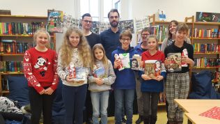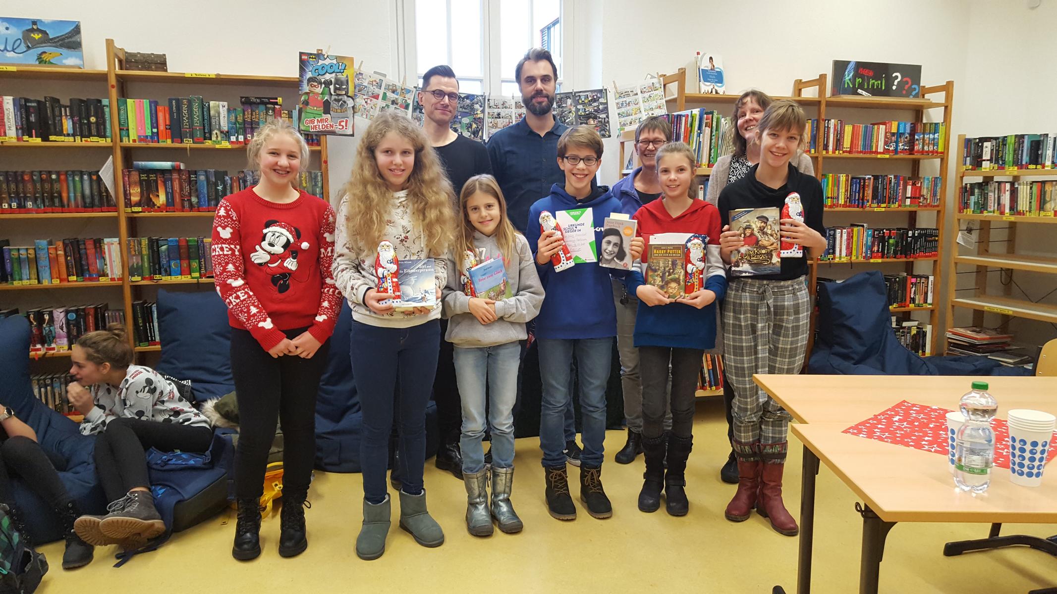 Fünf Nikoläuse als Belohnung: Die Vorlesejury (hinten) fand in Jakob Oldenstädt (Mitte) den besten Vorleser 2019.