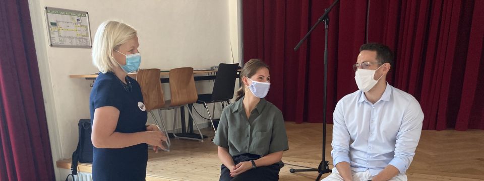 Mit Maske: Die diesjährige Einschulung fand unter besonderen Bedingungen statt. Unterstufenkoordinatorin Eva Redeker (links) begrüßte mit den Klassenlehrerteams - hier Sarah Voß und Tom Weber - die neuen Fünftklässler.