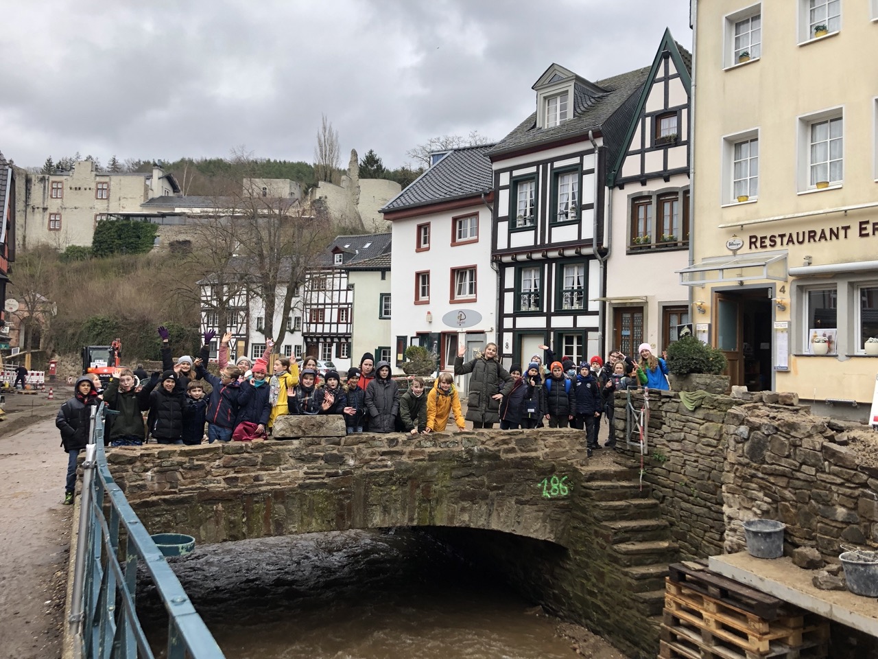 Viele Grüße aus Bad Münstereifel senden die Klassen 5b und 5d! Neben Spiel, Spaß und tollen gemeinsamen Erfahrungen haben wir auch eindrucksvoll erleben können, was die Flut in dem schönen Städtchen an der Erft letztes Jahr angerichtet hat und wie die Menschen bis heute tapfer wieder alles aufbauen.
