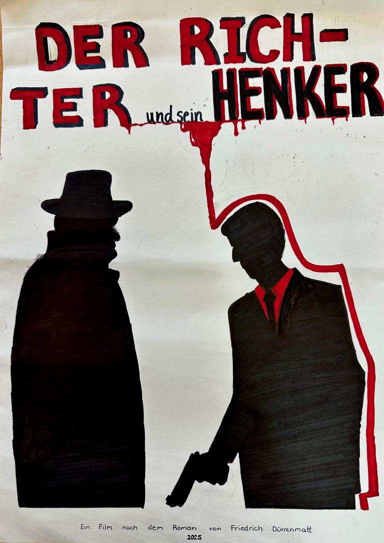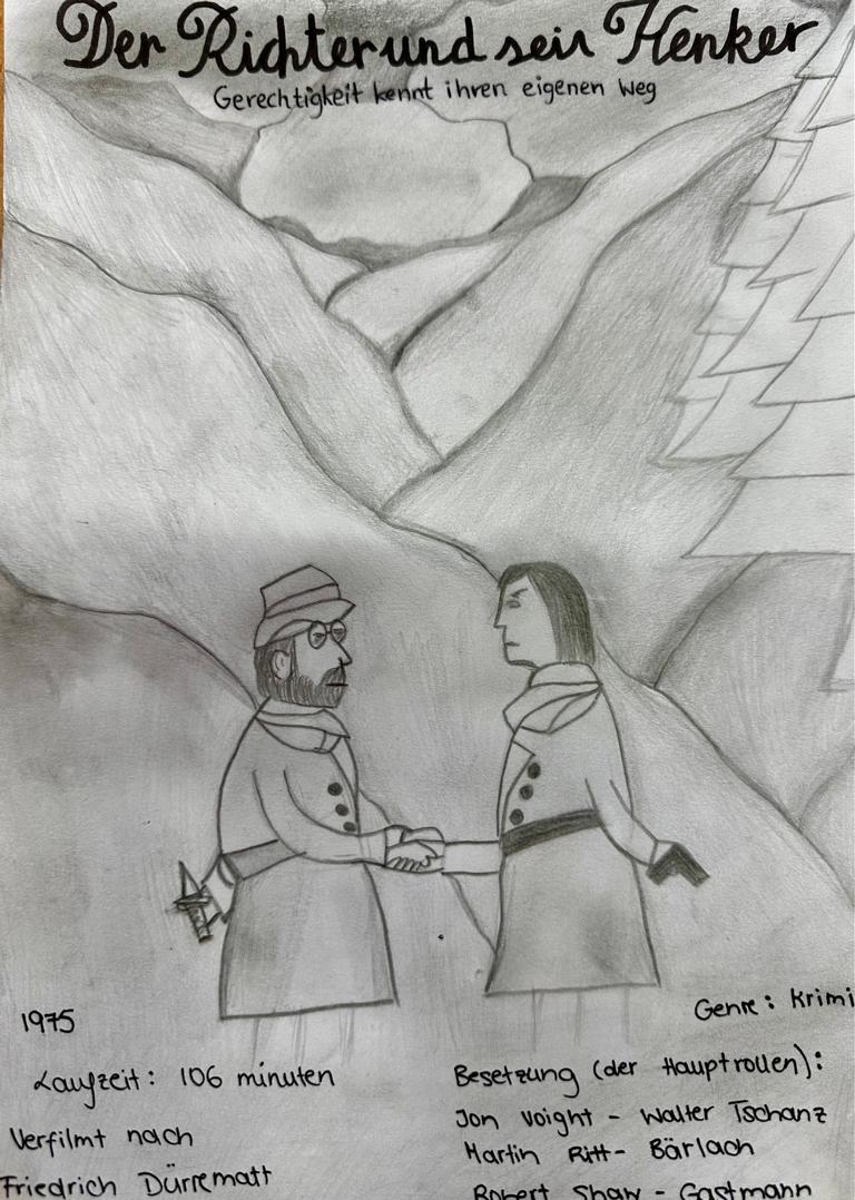 Im Deutschunterricht hat sich die Klasse 9d unter der Leitung von Frau Fießer intensiv mit dem Roman Der Richter und sein Henker beschäftigt. Dabei entstanden vielfältige kreative Projekte – ob als Comic, Hörspielszene, Filmplakat oder sogar als selbst erdachtes Escape-Room-Spiel. In Gruppen oder allein setzten die Schülerinnen und Schüler eigene Ideen um und konnten so den Roman aus ganz neuen Perspektiven erleben. Einige Ergebnisse sind hier zu sehen.