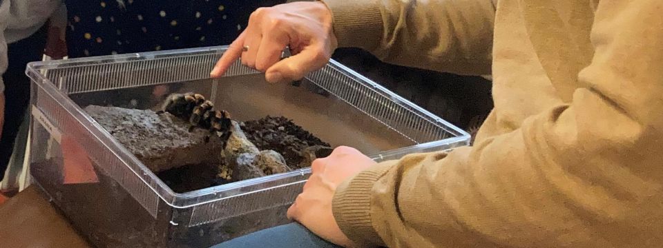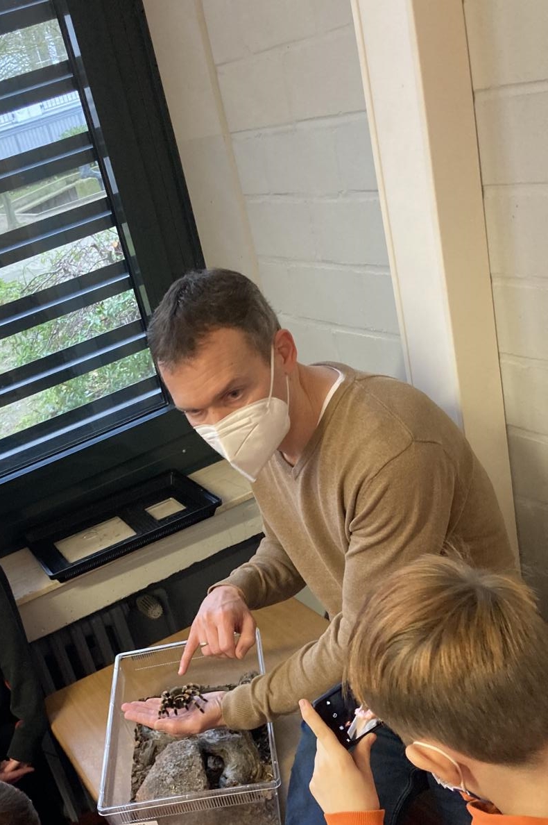 Anknüpfend an das aktuelle Unterrichtsthema, die Anpassungen des Eichhörnchens an seinen Lebensraum, suchte er  zunächst das Gespräch mit den Schüler*innen. Danach wurde das Geheimnis der großen Styroporkiste gelüftet, ein plastinierter Skorpion und mehrere  Überbleibsel von Häutungen traten zu Tage, bevor die Vogelspinne ihren großen Auftritt bekam. Der Star der Biologiestunde erzeugte vielfältige  Emotionen unter der Schülerschaft. Heute etwas divenhaft verspürte sie angesichts mutiger Schüler*innen kein Interesse, auf deren Hände zu krabbeln.