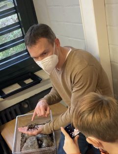 Da staunte die 5a nicht schlecht, als zwei Biologielehrer*innen  nach der großen Pause in ihrem Klassenraum auf sie warteten. Zudem ließen eine große Styroporkiste und Pappschachteln auf weitere Überraschungsgäste schließen. Herr Dr. Jochen Reiter, der Direktor des Aquazoo Löbbecke Museums Düsseldorf, ließ es sich nicht nehmen persönlich Einblicke in die große artenreiche  Sammlung und die lebenden „Unterrichtstiere“ zu geben.