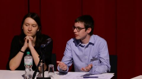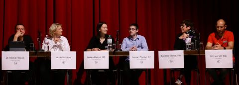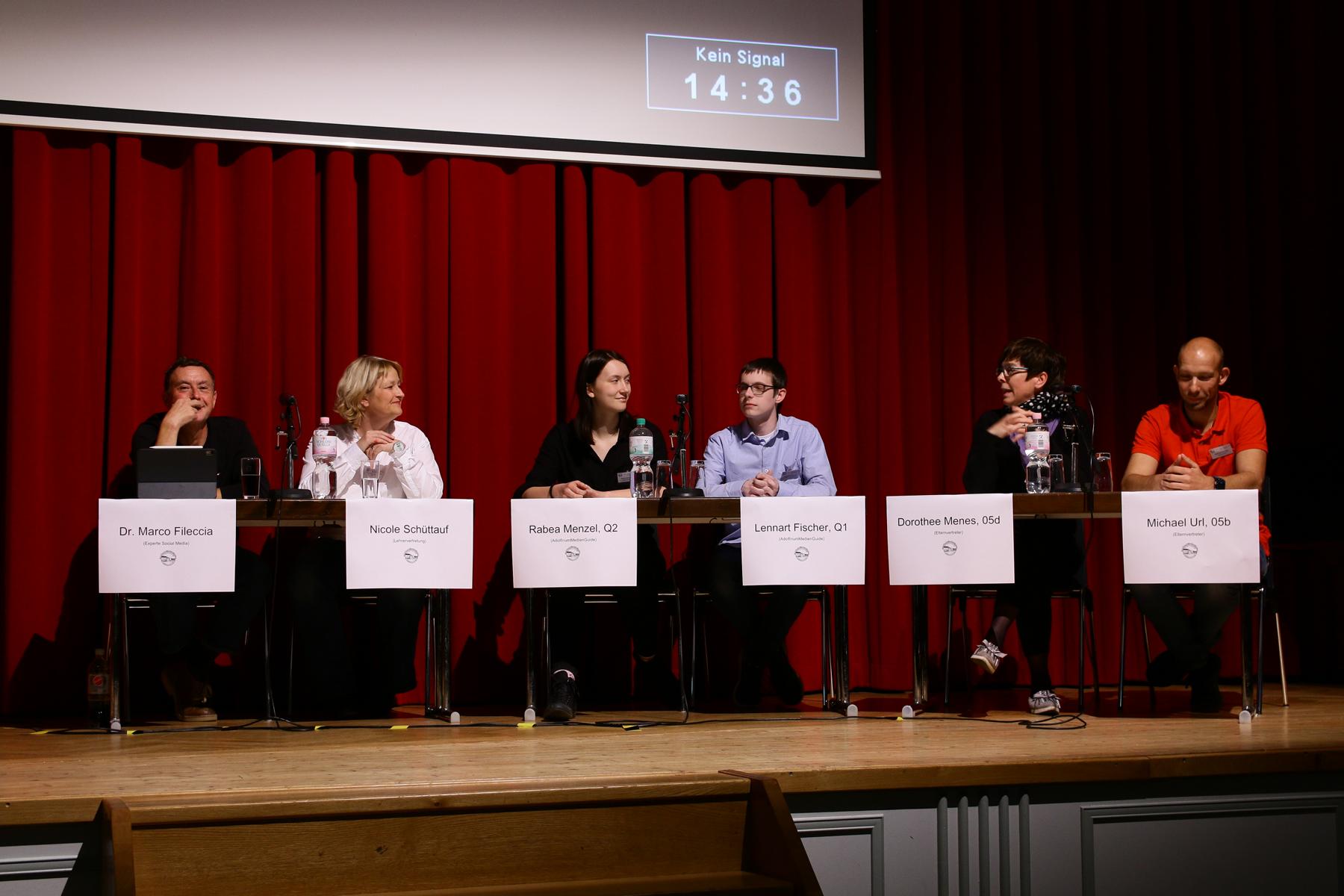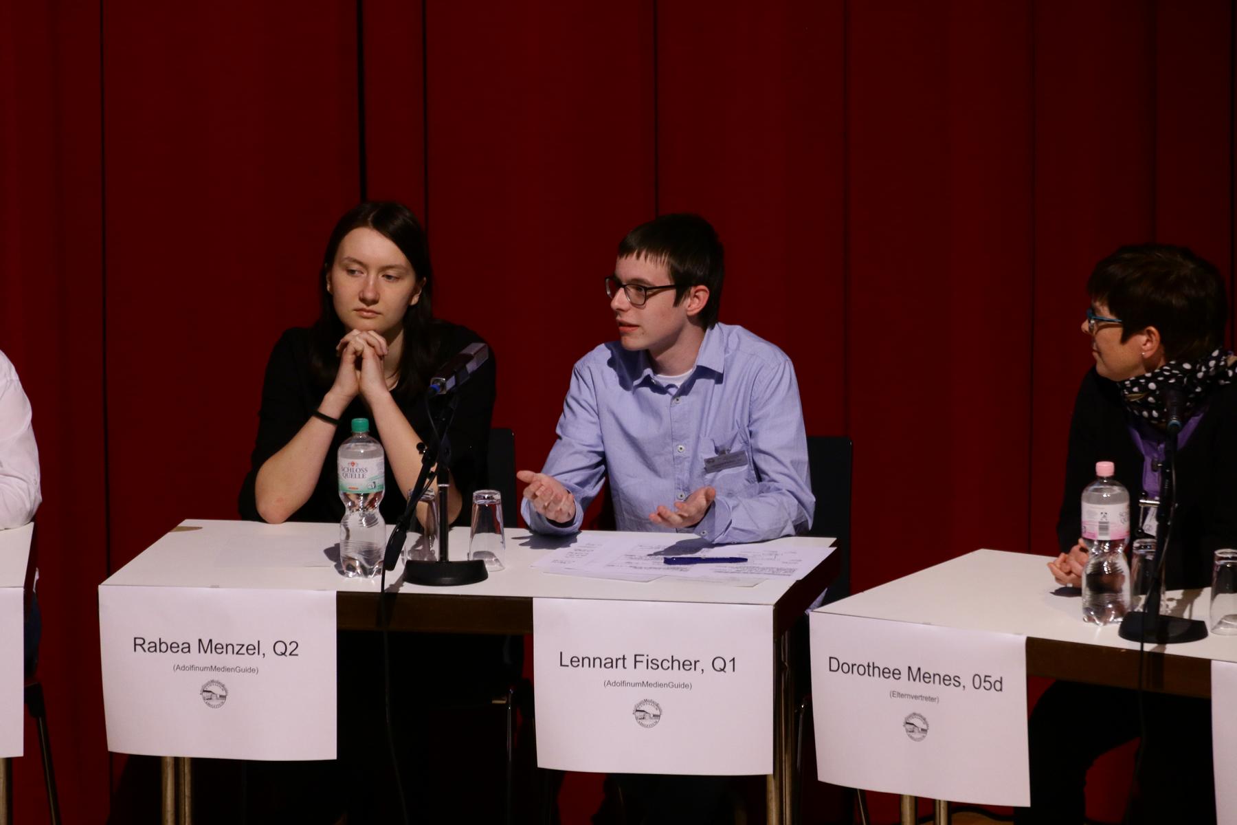 In der anschließenden Podiumsdiskussion diskutierten auf dem Podium Rabea Menzel und Lennard Fischer (MedienGuides), zwei Elternvertreter, Nicole Schüttauf (Lehrerin am Adolfinum) sowie Marco Fileccia als weitere Experten. In der hitzigen Debatte ging es vor allem um die Mediennutzung durch Jugendliche und Kinder, in besonderer Weise um das Verhältnis zwischen Kind und Eltern in Bezug auf deren Mediennutzung.