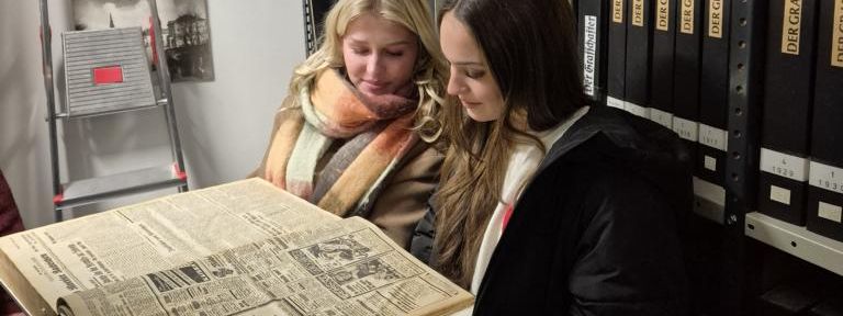 In einem Archiv werden jedoch nicht nur Papierquellen aufbewahrt. Wir sahen auch Bilder auf Dias und alte Filmrollen, die ebenfalls in diesem Raum gelagert werden. Ein besonderes Highlight war, dass wir einige wichtige Quellen selbst in den Händen halten und untersuchen durften. Dabei erfuhren wir noch mehr darüber, wie sich die deutsche Schrift und Sprache im Laufe der Jahre verändert haben.