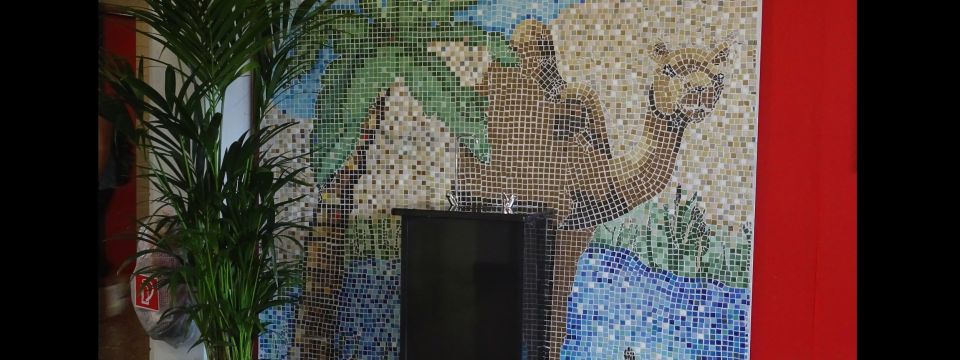 Nun folgte der nächste Schritt, denn ein Brunnenbau im Schulgebäude verlangte eine geradezu professionelle Herangehensweise. Mit Kollegin und Kunstlehrerin Franziska Bietenbeck stieg man in die Planungen ein. Mit dem Kunstkurs erörterte sie die Gestaltung. Eine Jury entschied über die Entwürfe. Die Idee von Marie Winkelmann Überzeugte alle. „Ich habe die Idee einer Oase in der Wüste verfolgt“, erzählt die 18-Jährige, die mittlerweile ihr Abi in der Tasche hat. Zu den Motiven Oase, Wüste und Wasser gesellten sich schnell gestalterische Elemente wie Palme und Kamel.
