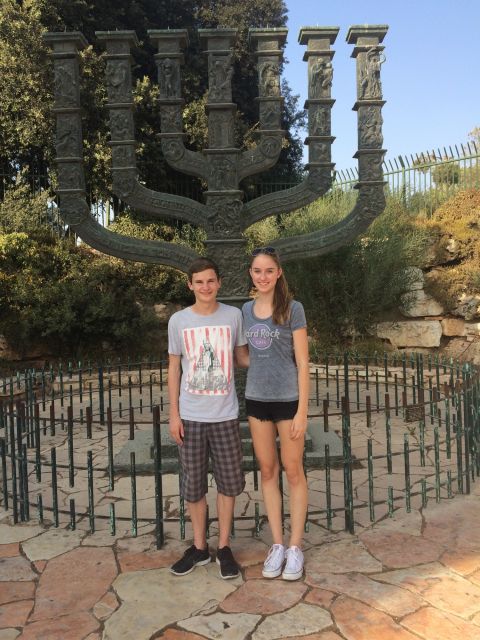 Vor der Knesset-Menora: Dominik und Maike beim Besuch des israelischen Parlaments.