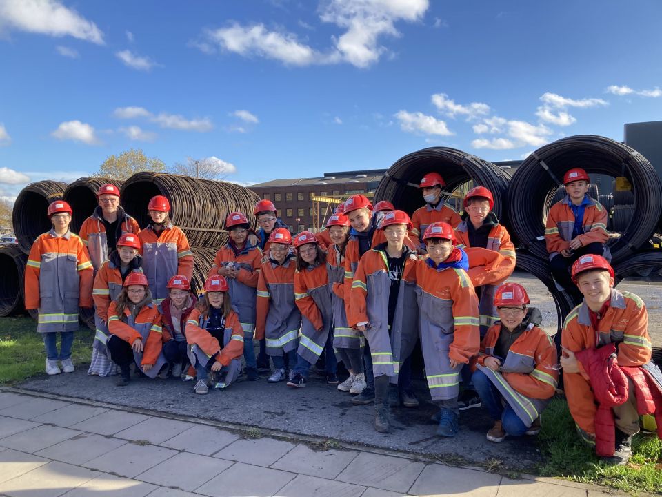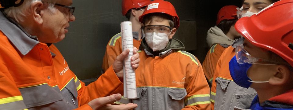 Mit Helm, Schutzbrille und Sch(m)utzkittel ausgestattet erhielten 22 SchülerInnen eindrucksvolle Einblicke in das Oxygenstahlwerk und die Weiterverarbeitung des Stahls im Knüppelwalzwerk sowie dem Drahtwalzwerk von ArcelorMittal. Ehemalige Mitarbeiter erfüllten die Geschichte der Stahlverarbeitung in ihren Erzählungen wieder mit Leben und beeindruckten neben den riesigen Werksanlagen die Jugendlichen mit einem Stück Ruhrgebiet zum Anfassen.
